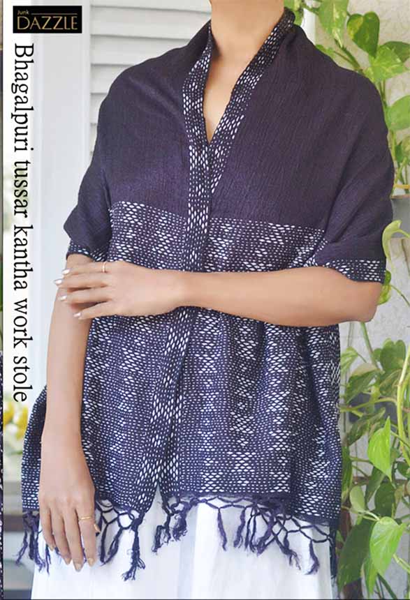 Introducing an embodiment of timeless elegance and intricate artistry – the Bhagalpuri Tussar stole adorned with exquisite Bengal Kantha work. Crafted with precision and passion, this stole is a testament to the fusion of two distinct yet harmonious traditional crafts.