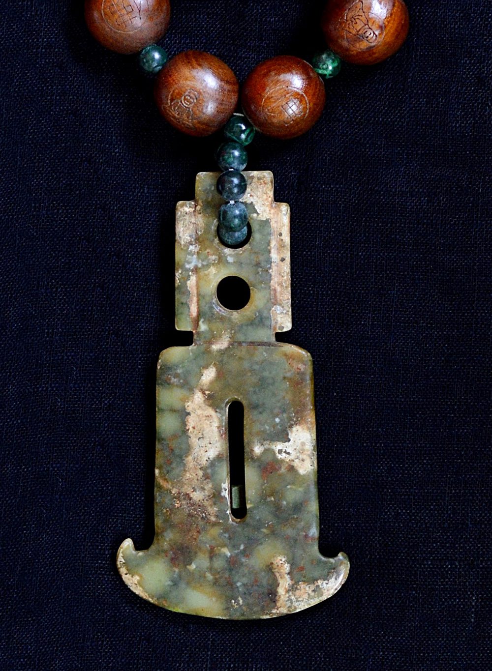 Rare Hongshan Culture Hand Carved Antique Vintage Old Jade Pendant with Carved Wooden Tibetan Buddhist Prayer Meditation beads and moss green malachite beads