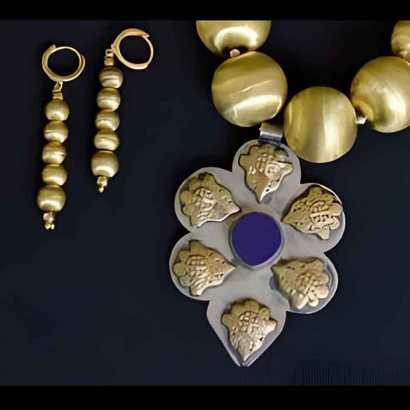 Old Afghani Pendant with gold toned ball beads and and earrings