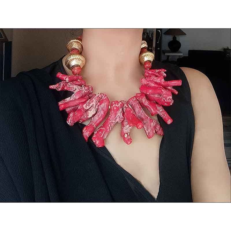 Chunky large raw coral branch sticks necklace with Nepali gold beads