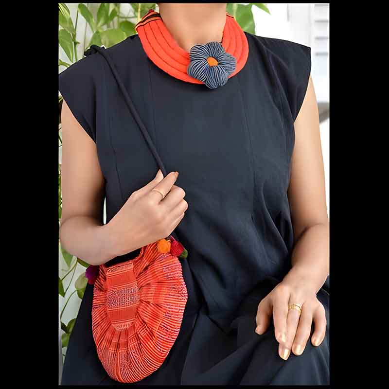 Multilayered silk bib necklace with handwork kutchi work back and handwoven woolen crochet flower pendant
