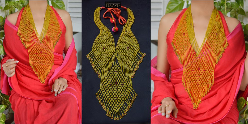 Handcrafted Silk Bib necklace with gold plated Tibetan Prayer Box Ghau pendant and beads- JD3882